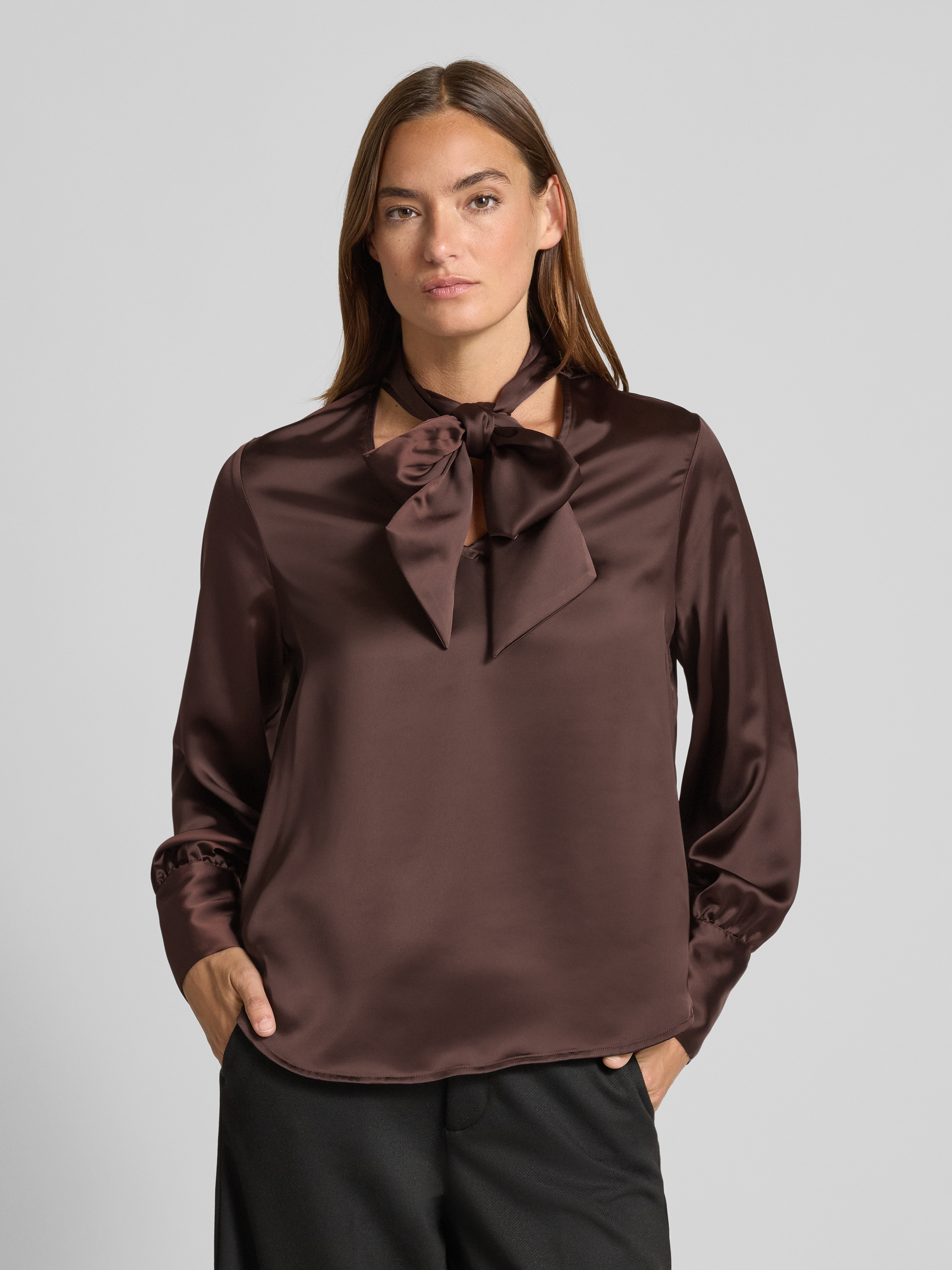 Relaxed fit strikblouse van satijn in donkerbruin