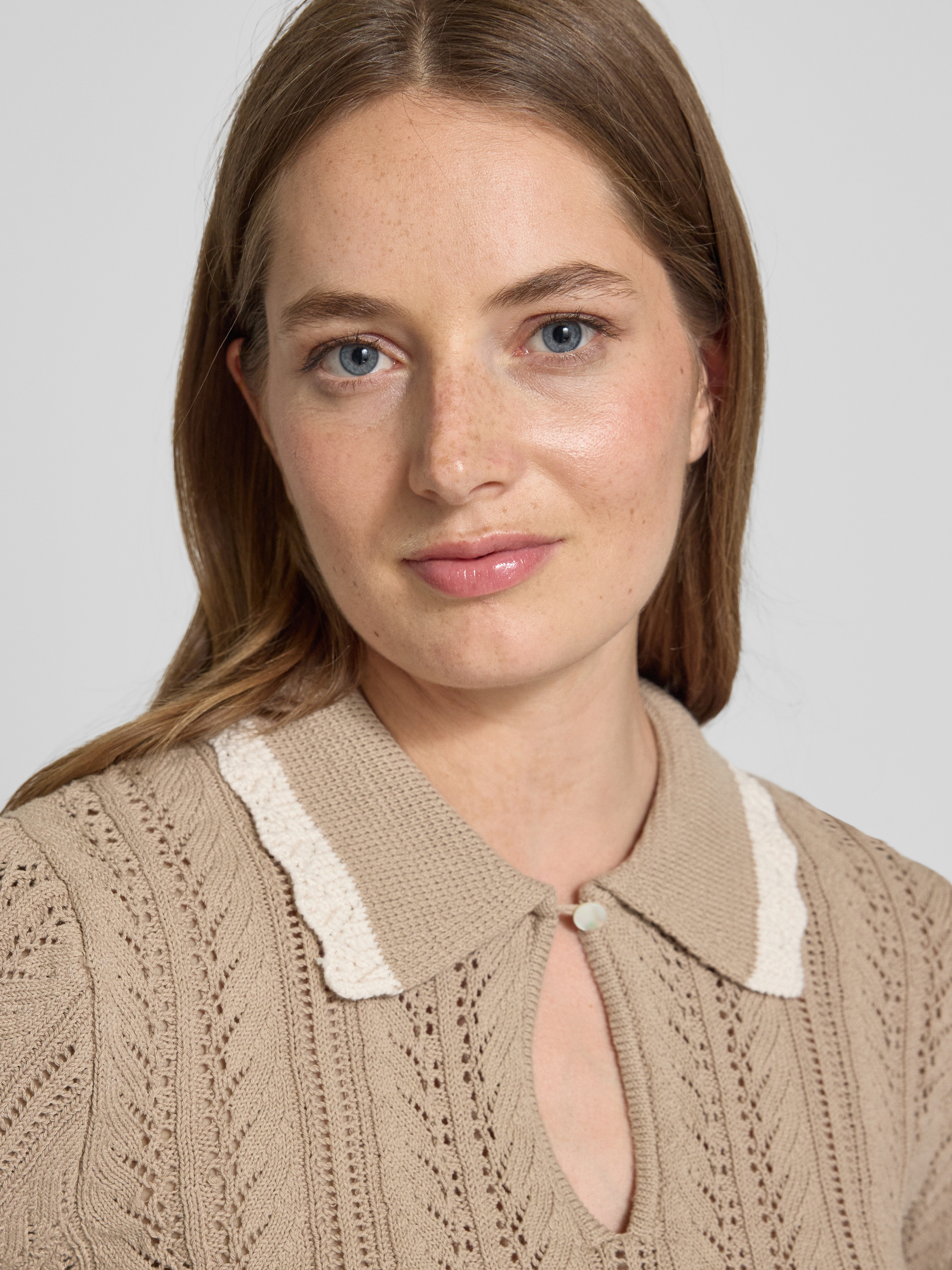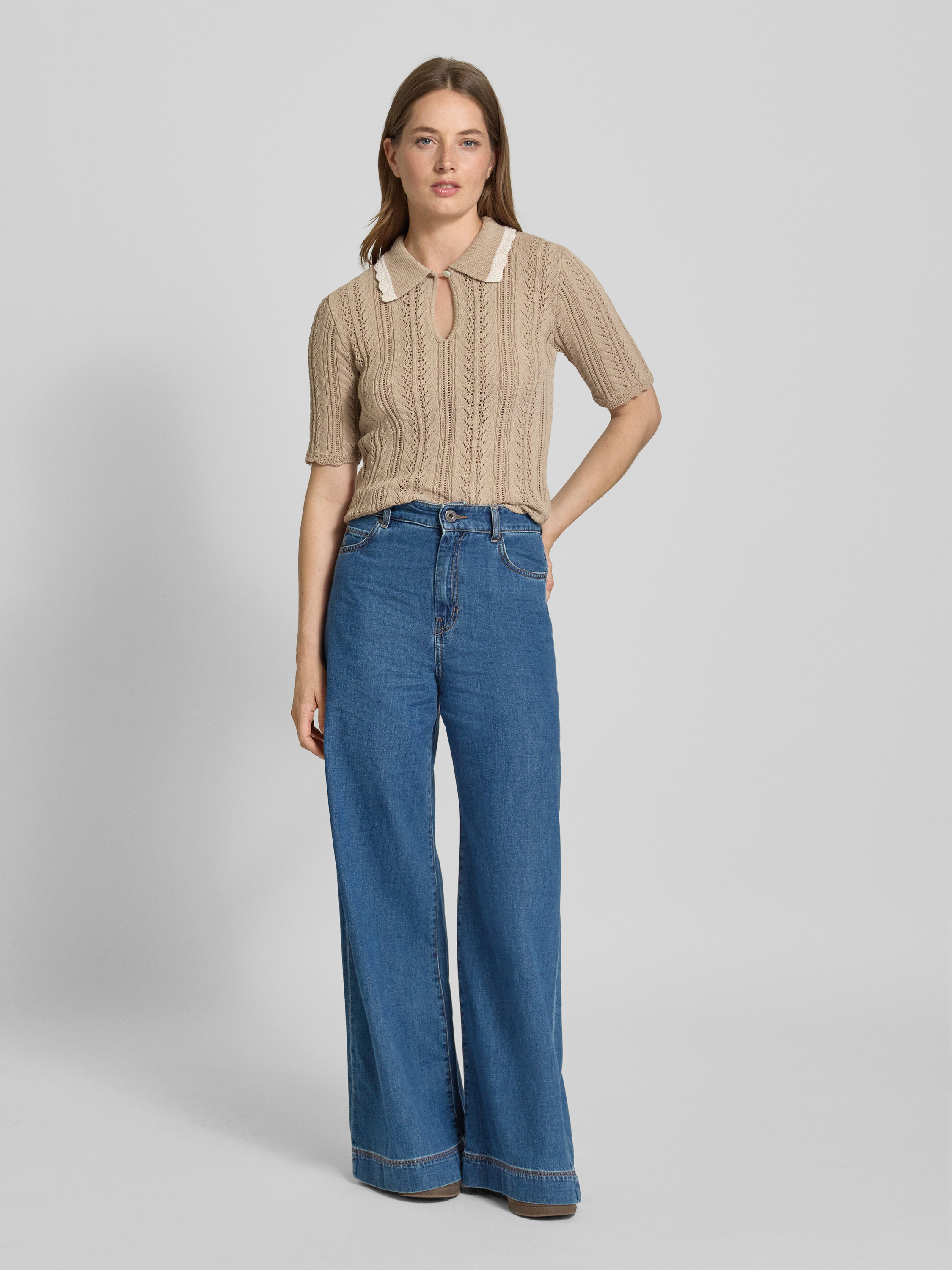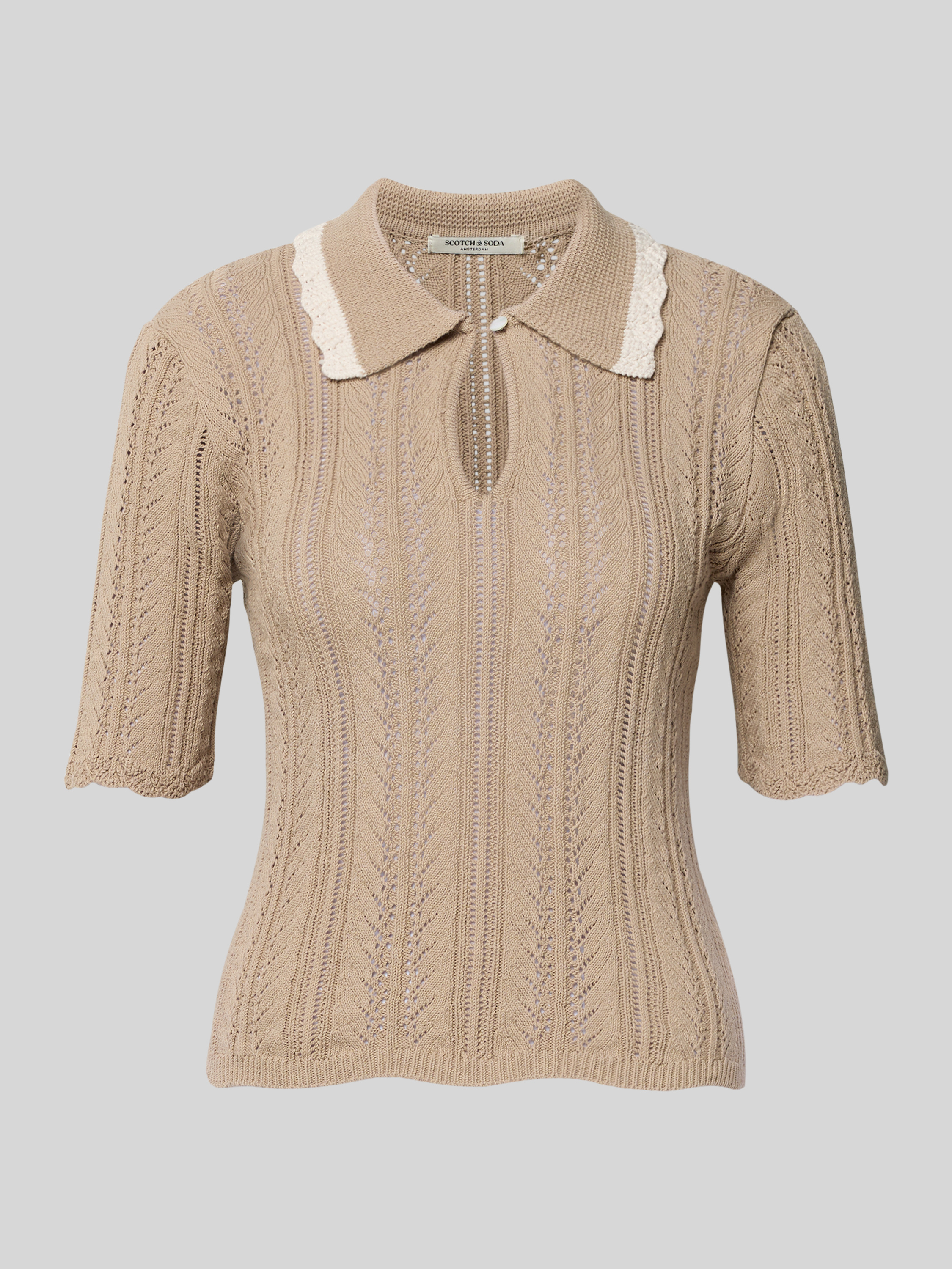 Gebreid shirt met platte kraag en druppelvormige hals in zand