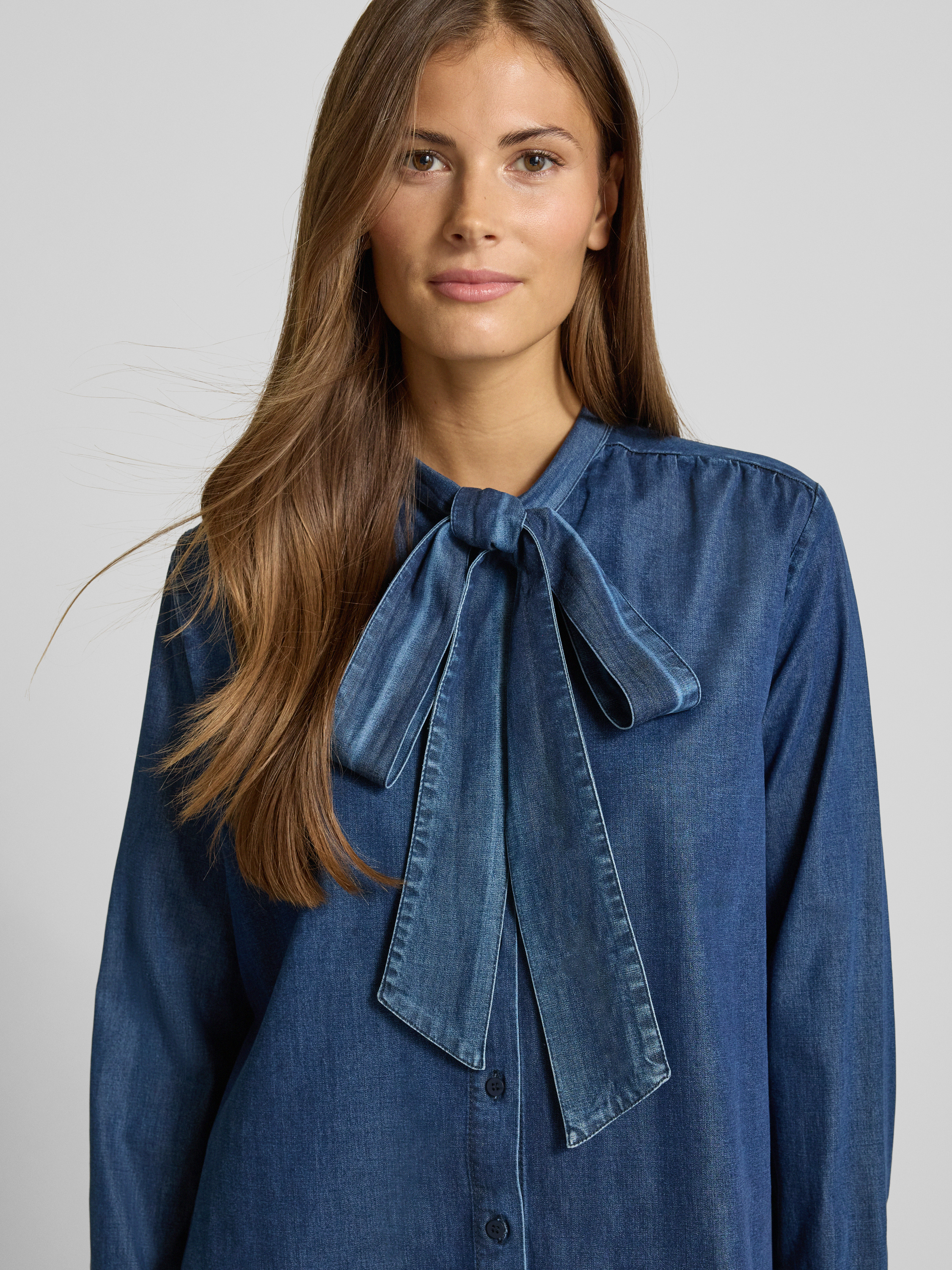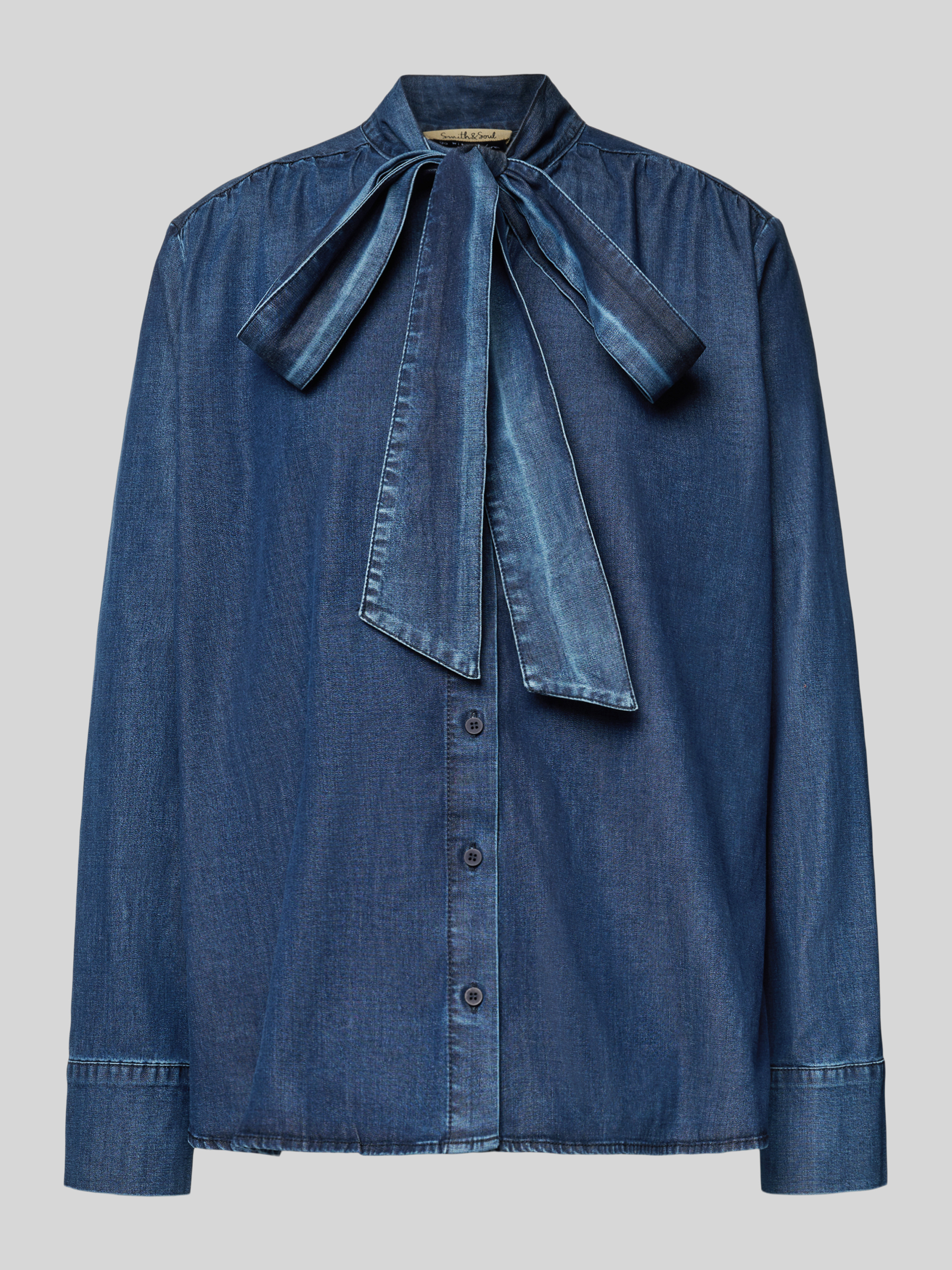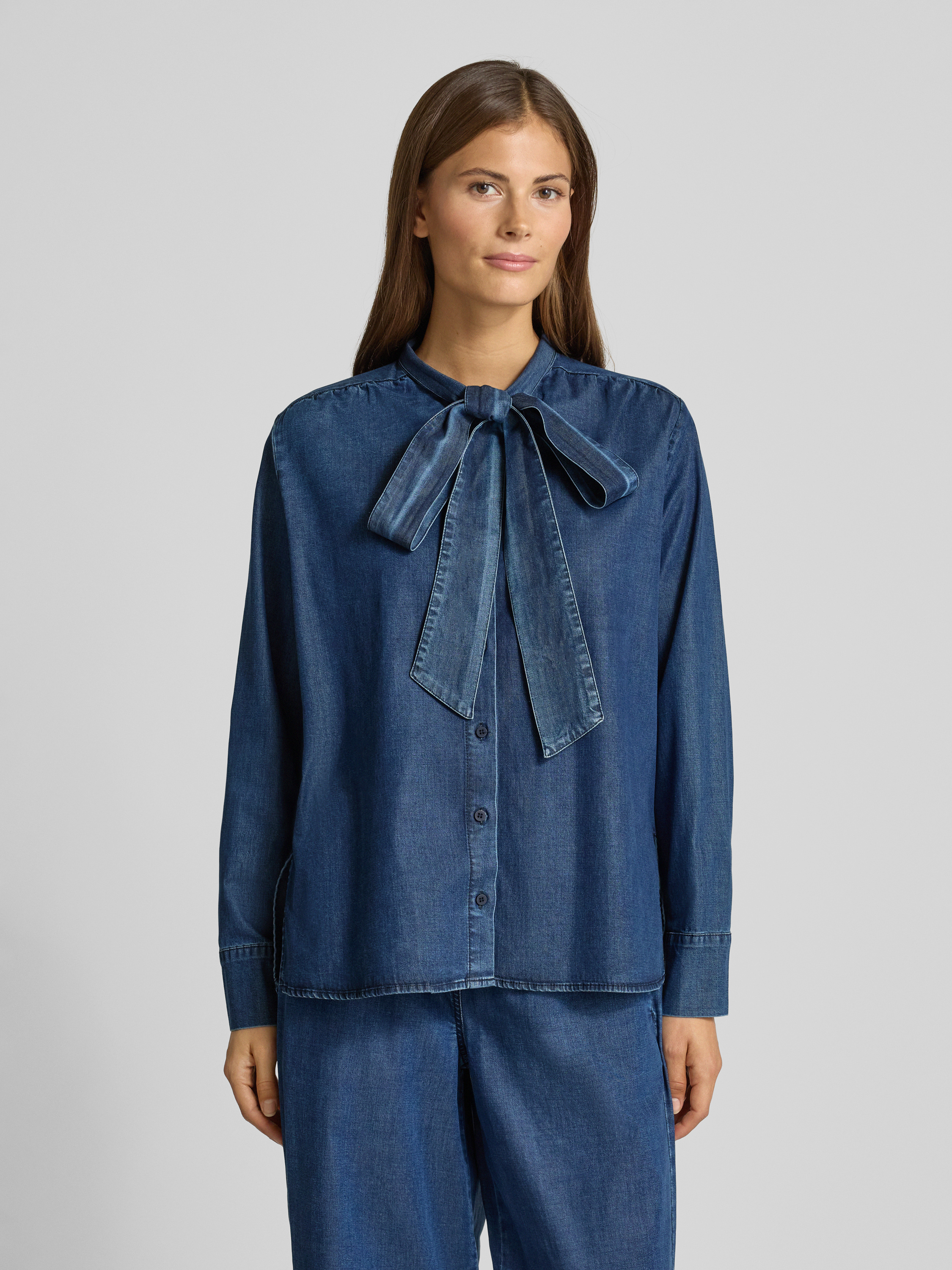 Jeansblouse met strik en knoopsluiting in jeansblauw