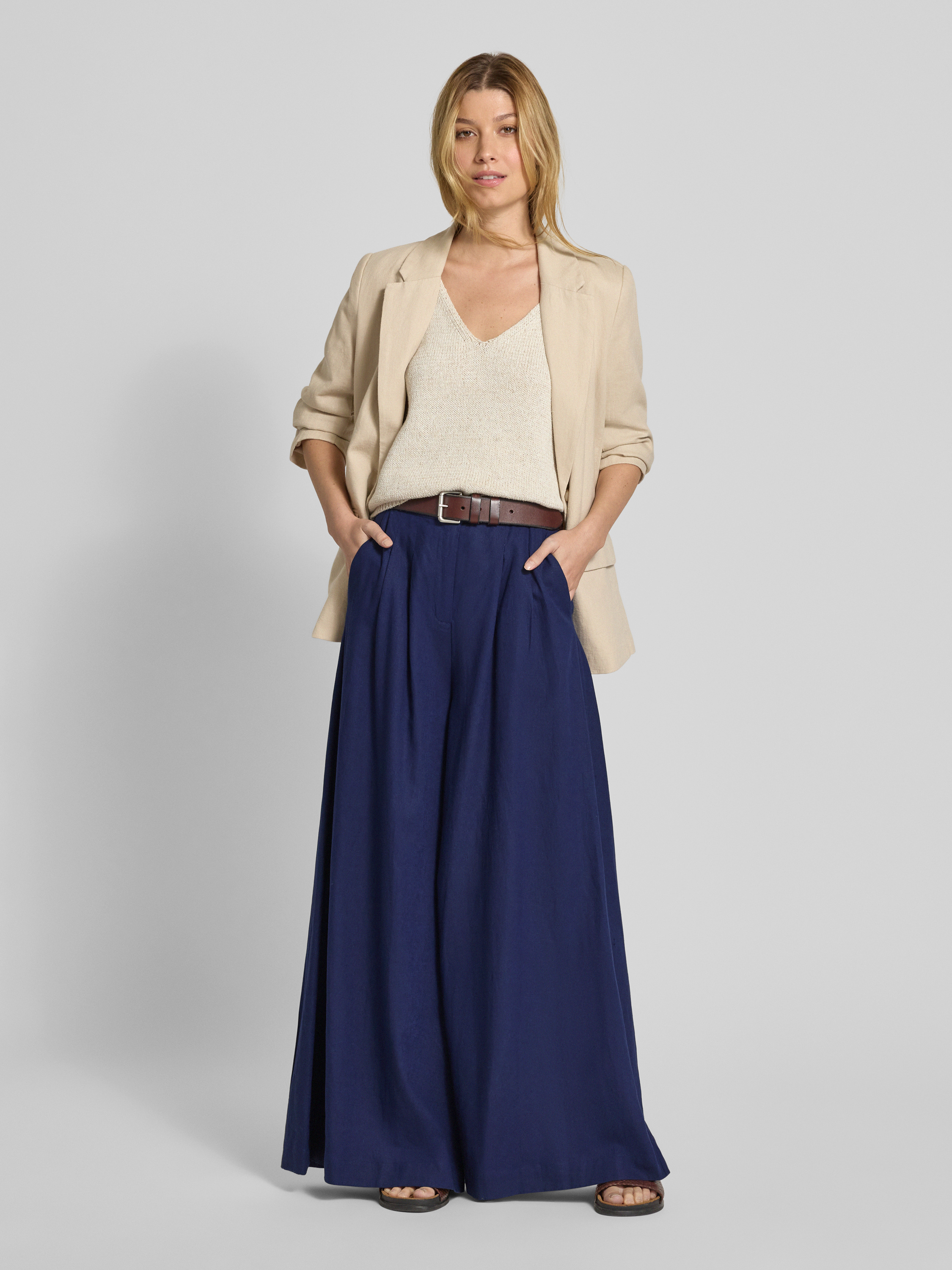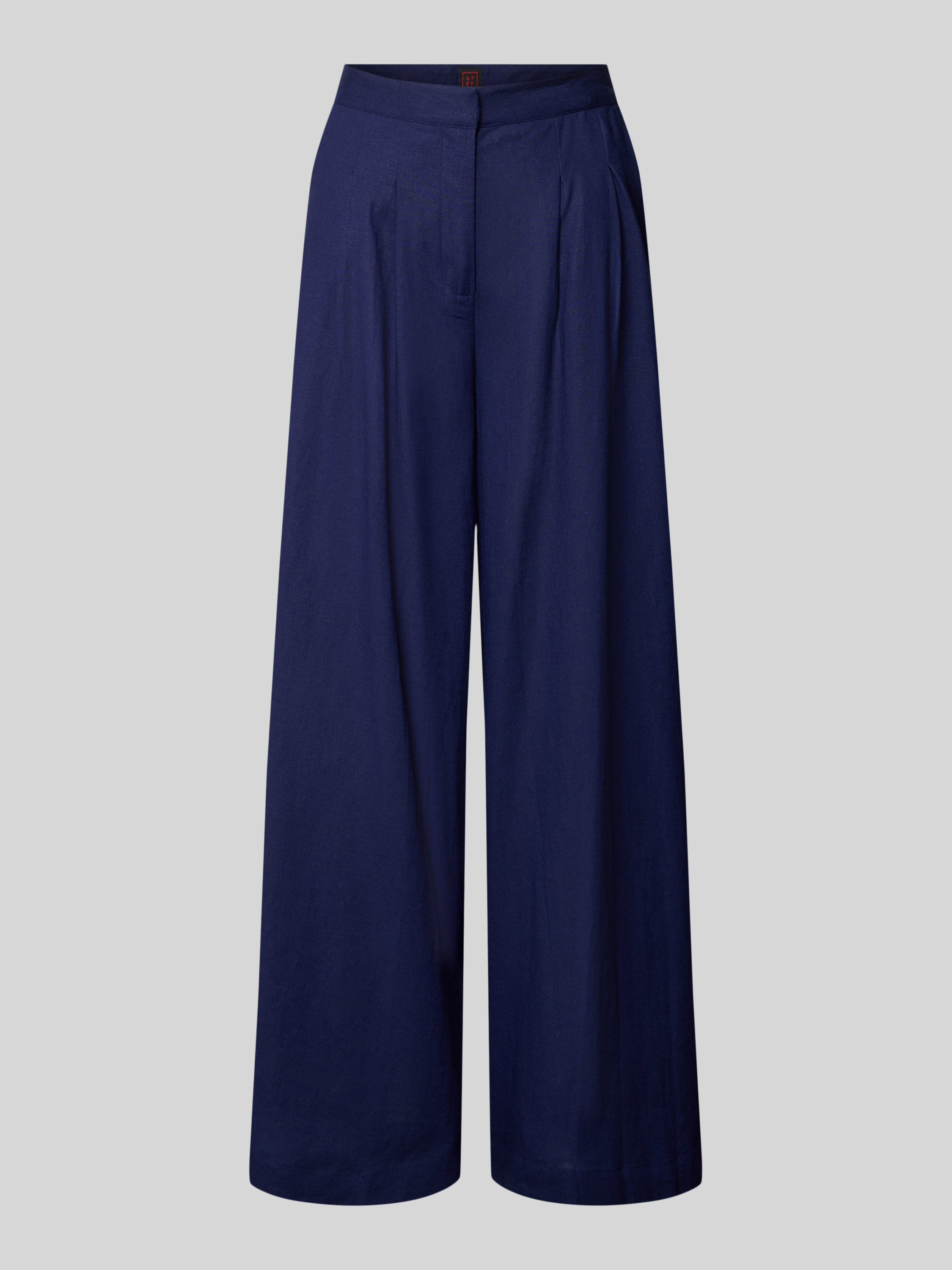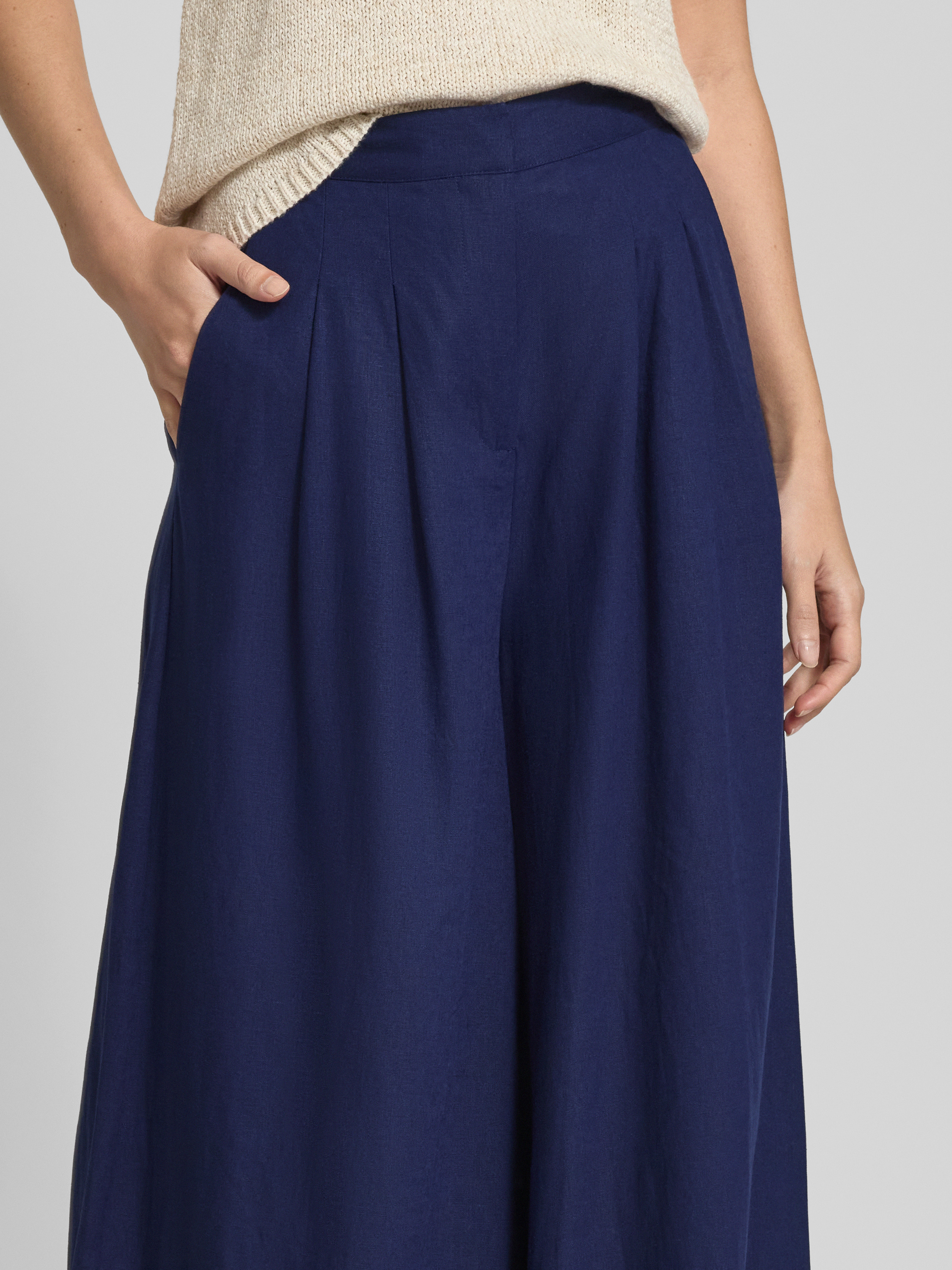 Wide fit stoffen broek van een mix van linnen en viscose met plooien in marineblauw