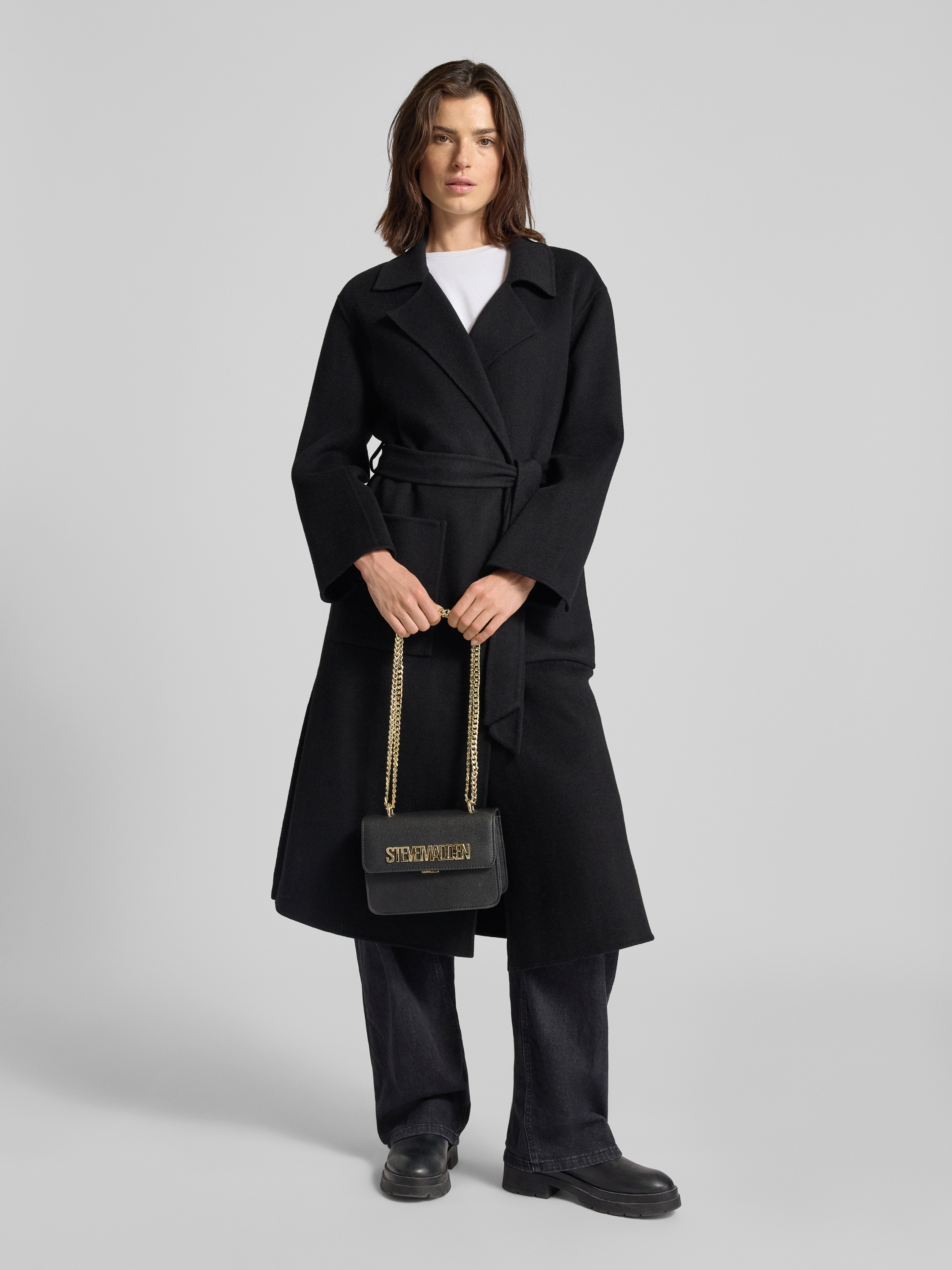 Lange jas van lanawolmix met strikceintuur, model 'ALLEGORIA'