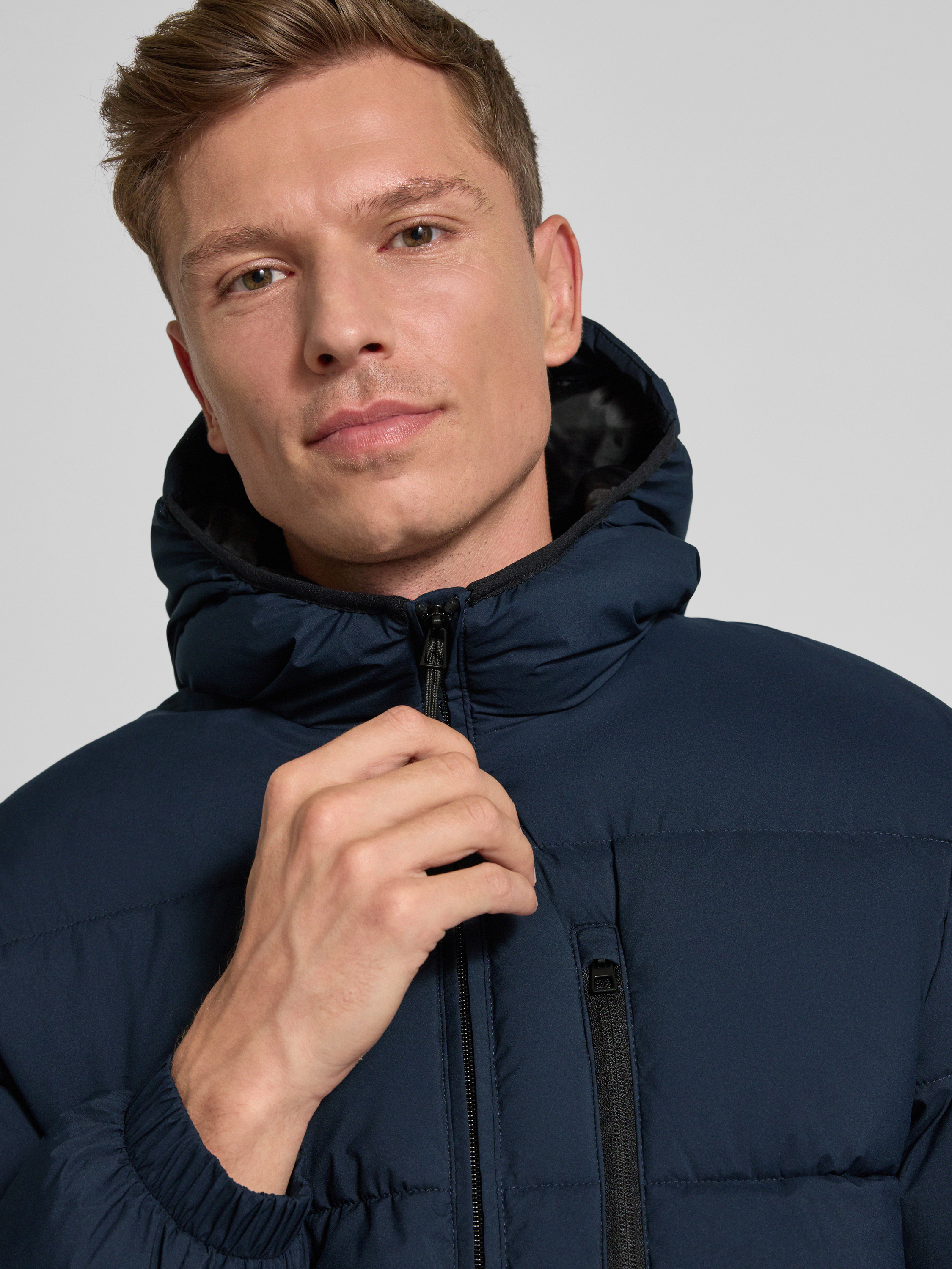 Gewatteerd regular fit jack met capuchon in donkerblauw