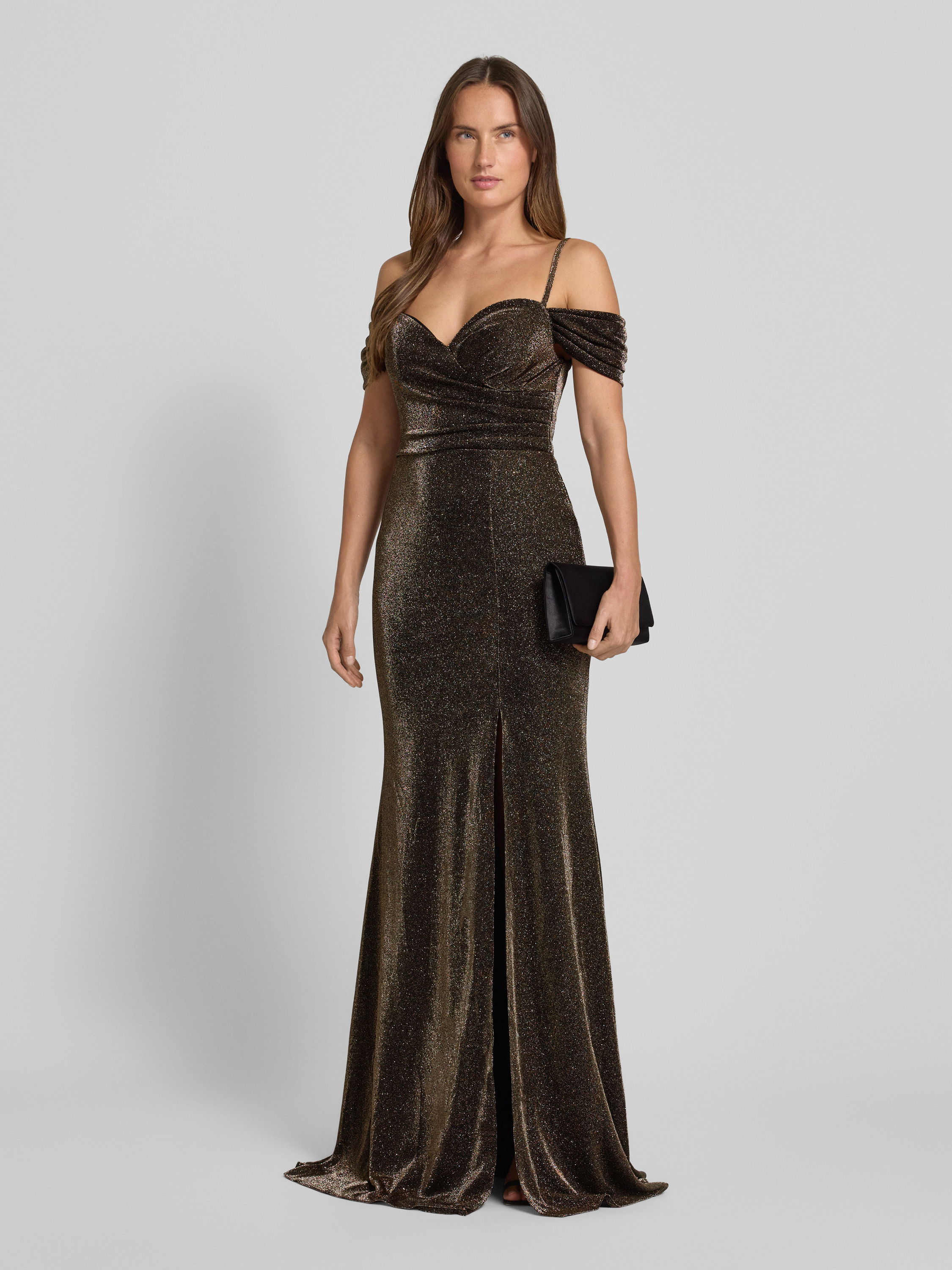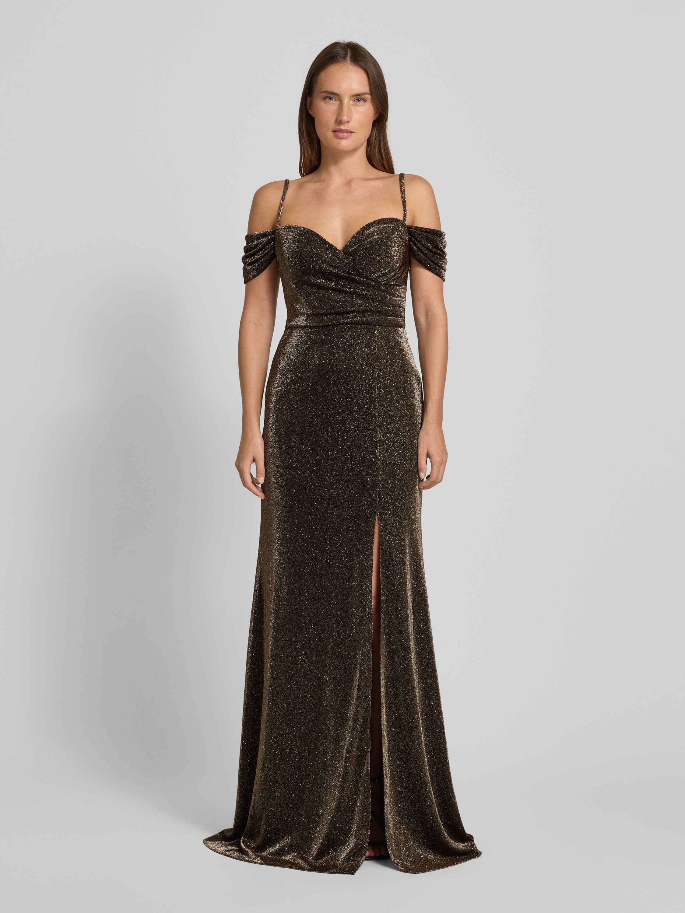 Avondjurk met hartvormige hals en loopsplit in goud gemêleerd