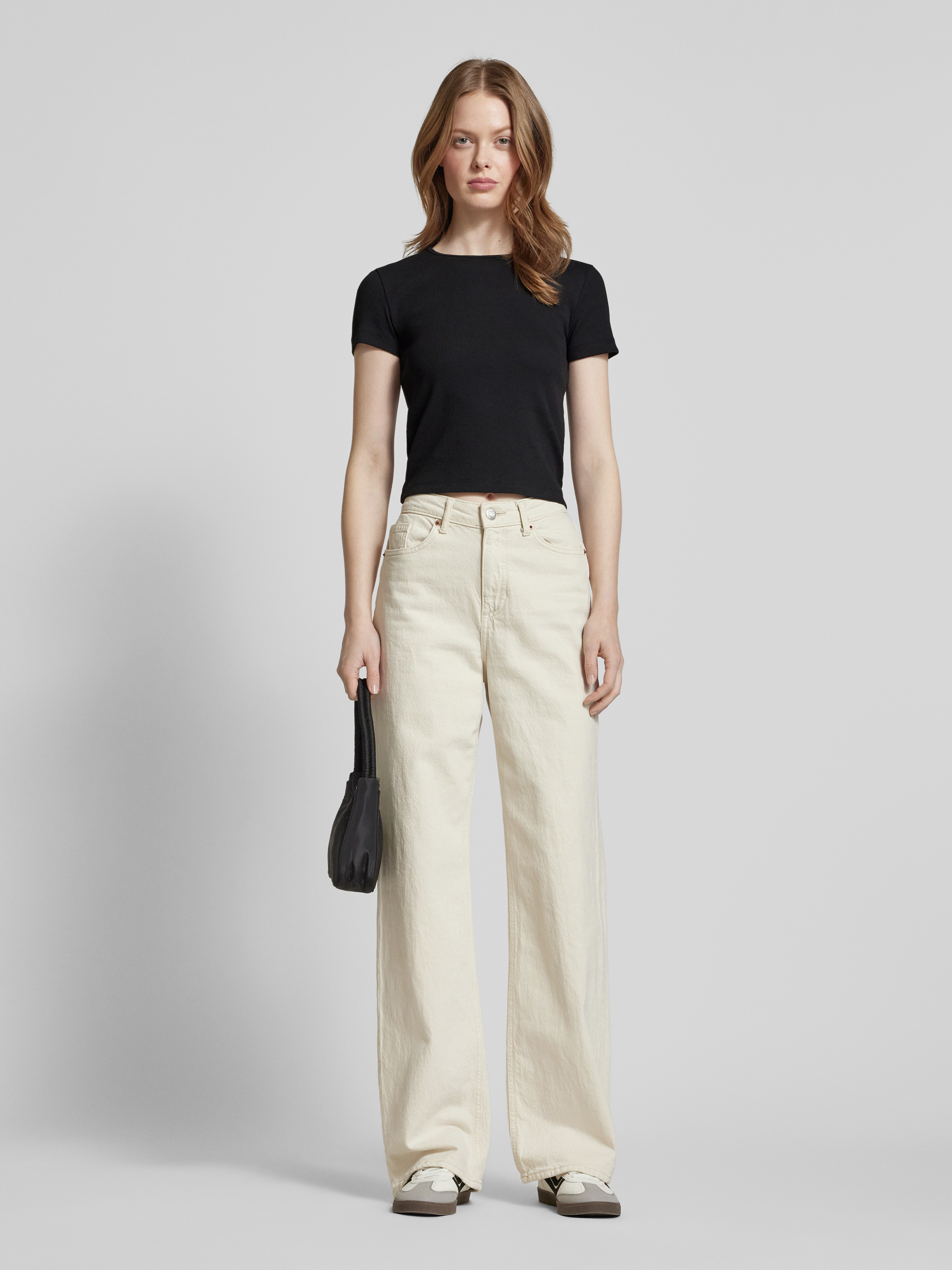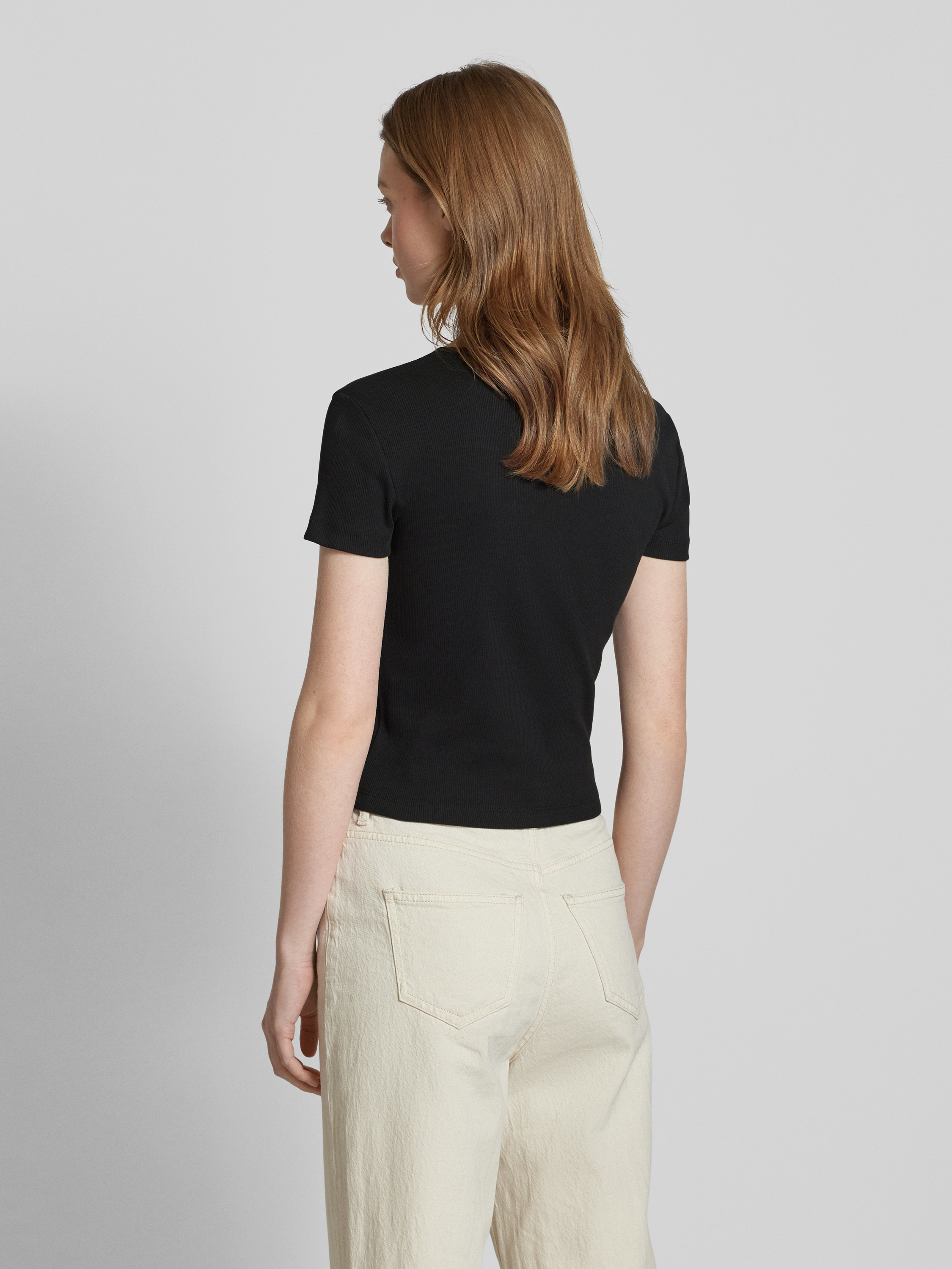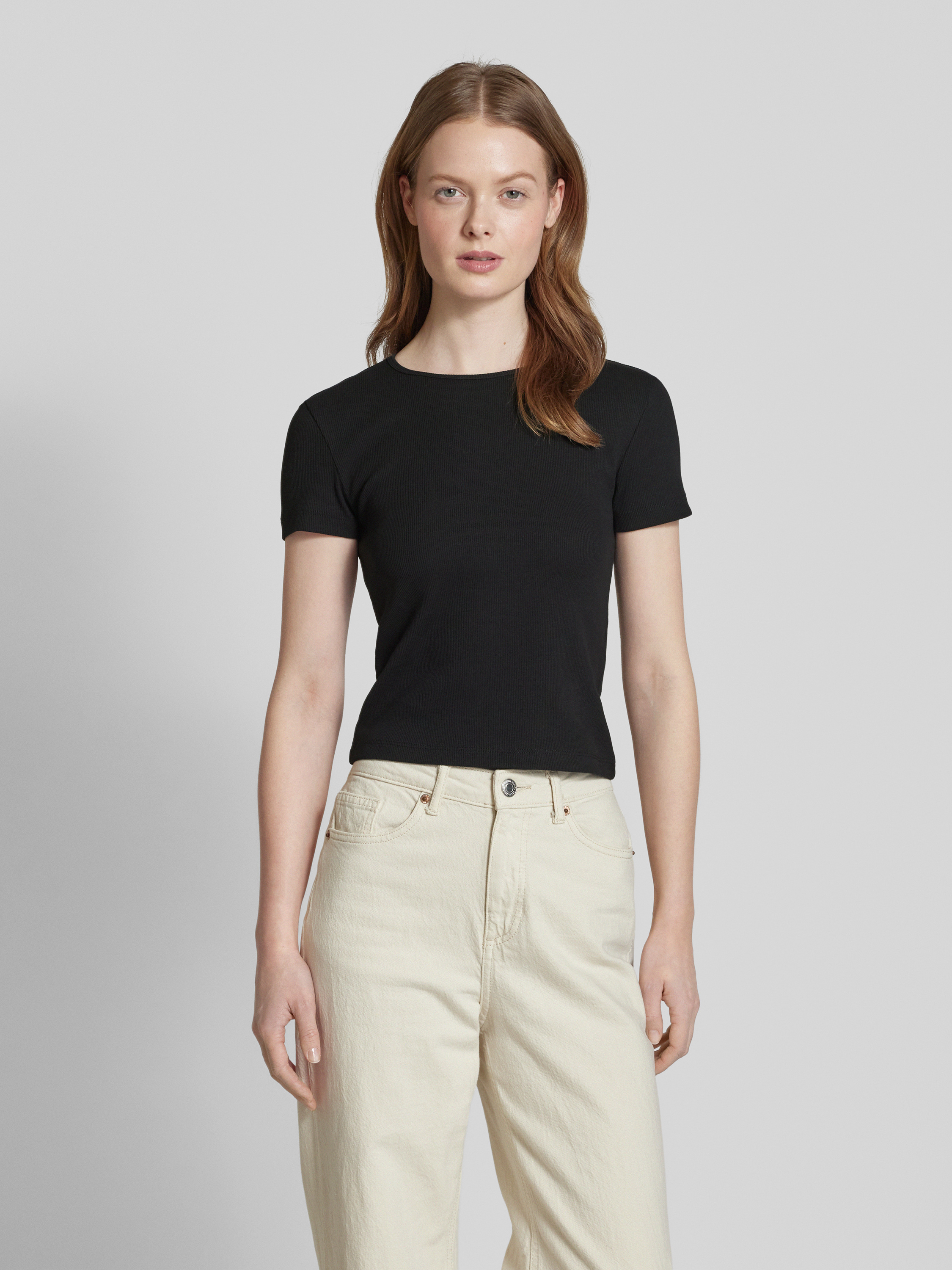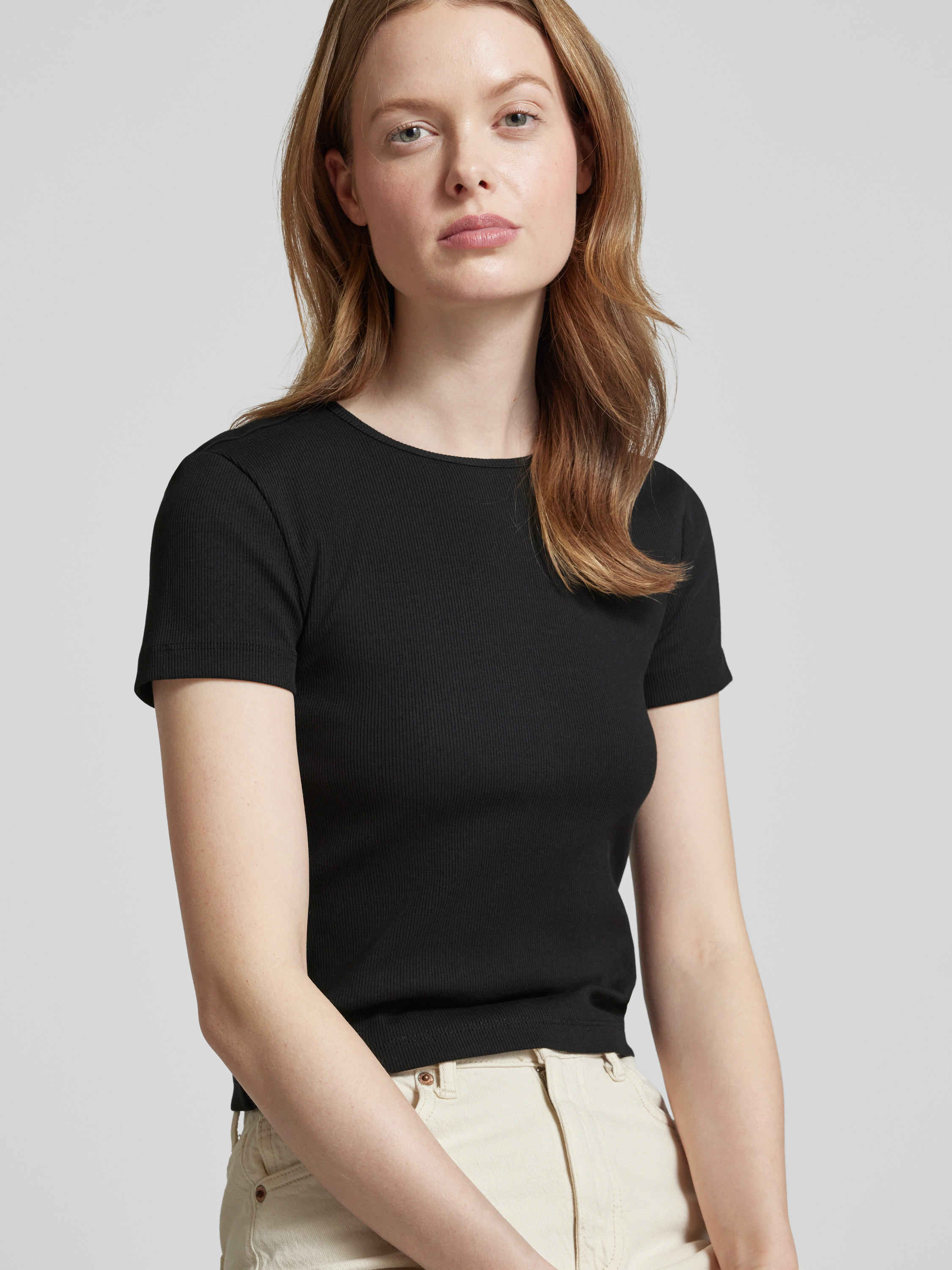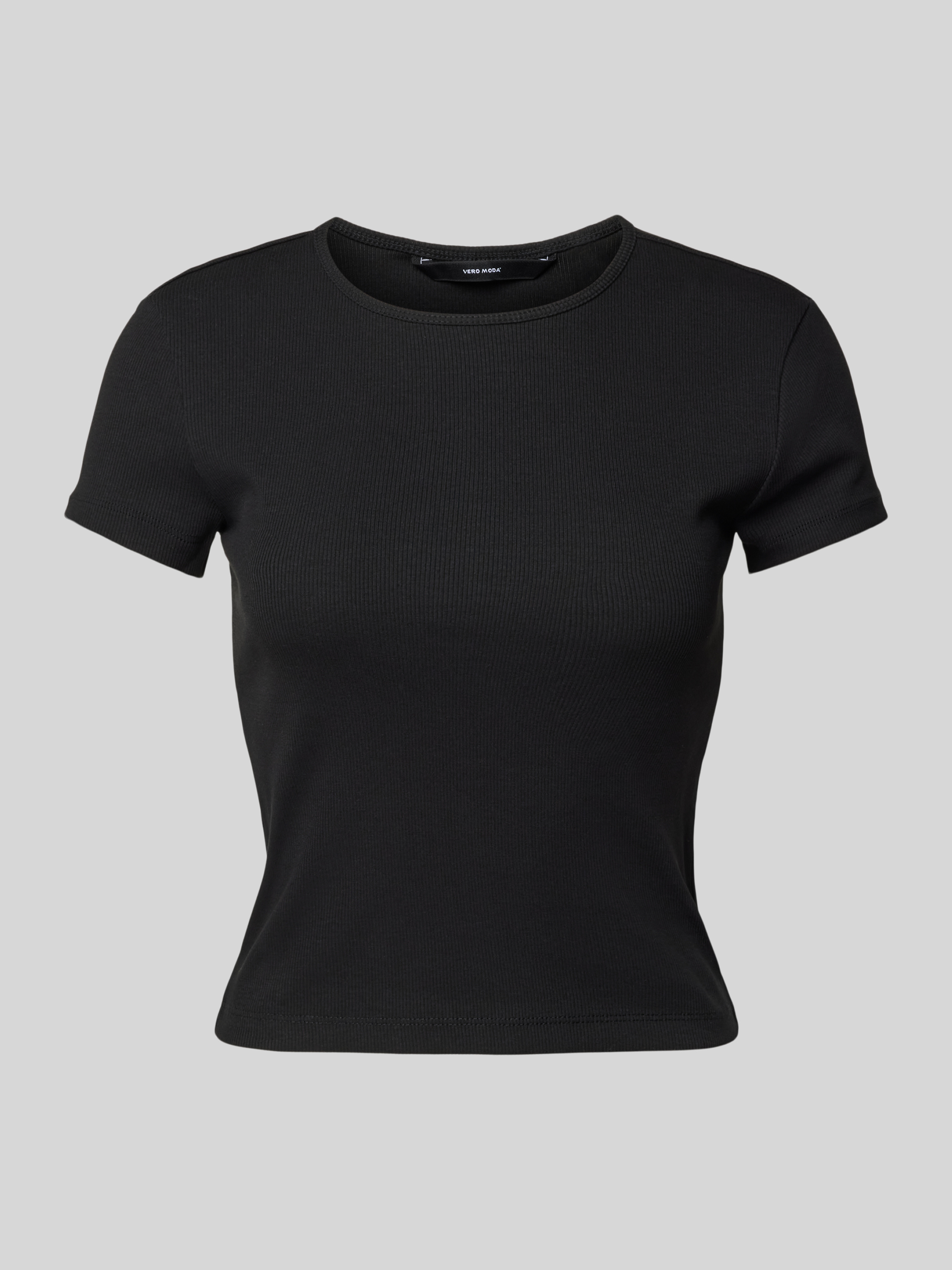 Regular fit T-shirt met geribde look, model 'CHLOE' in zwart