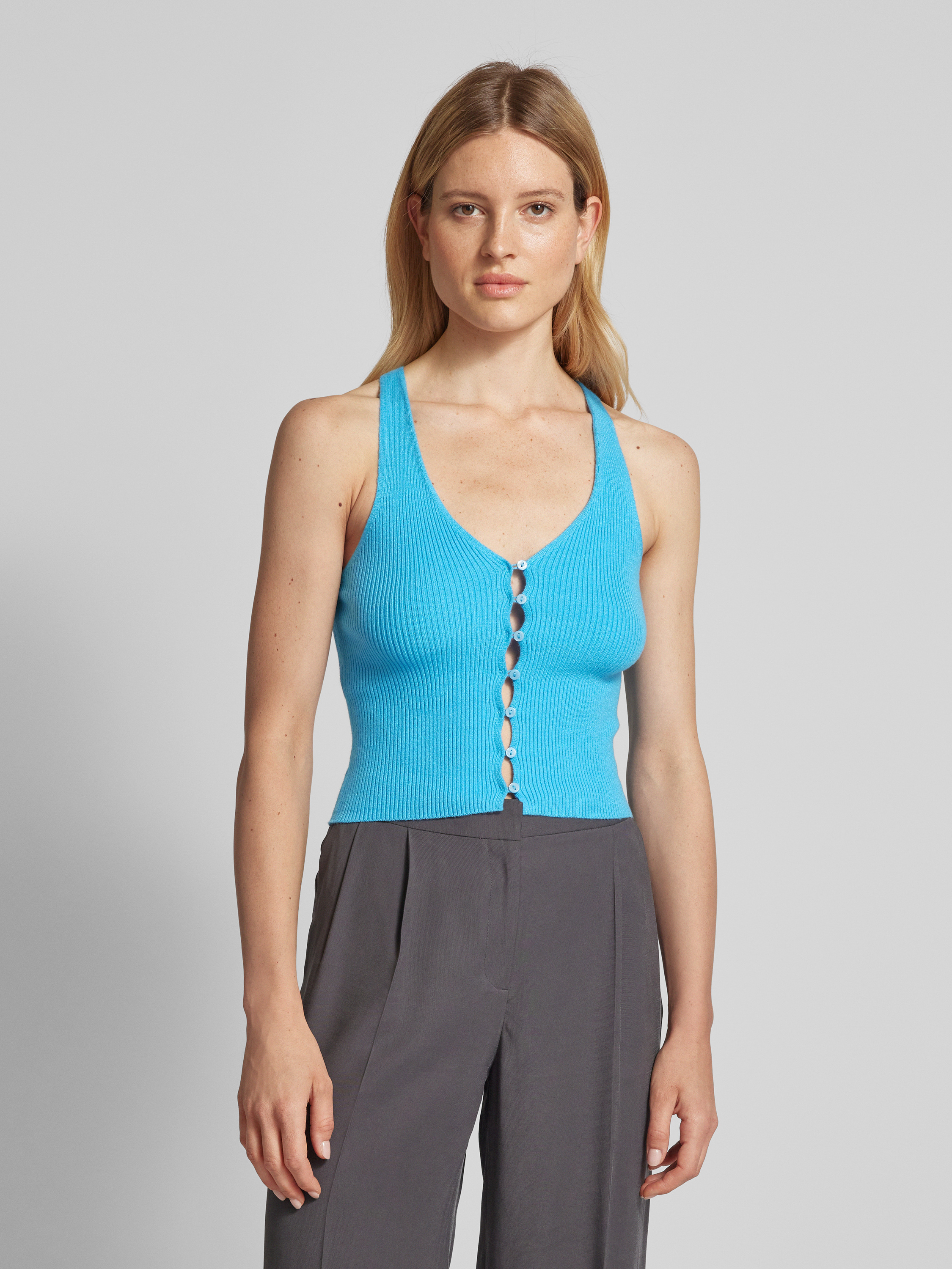 Top met bandjes en V-hals. in lichtturquoise