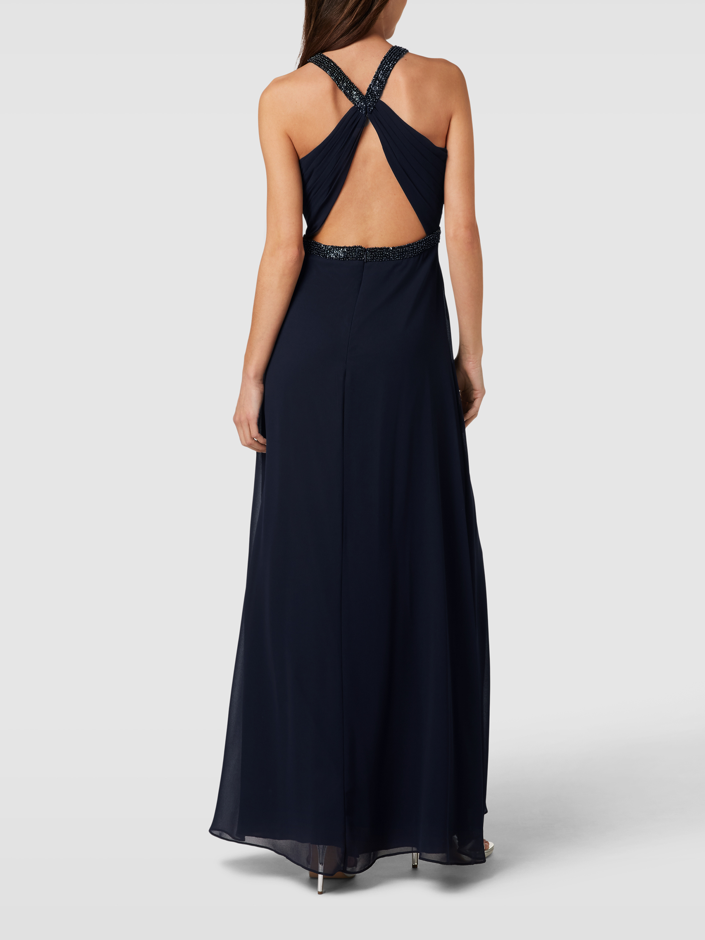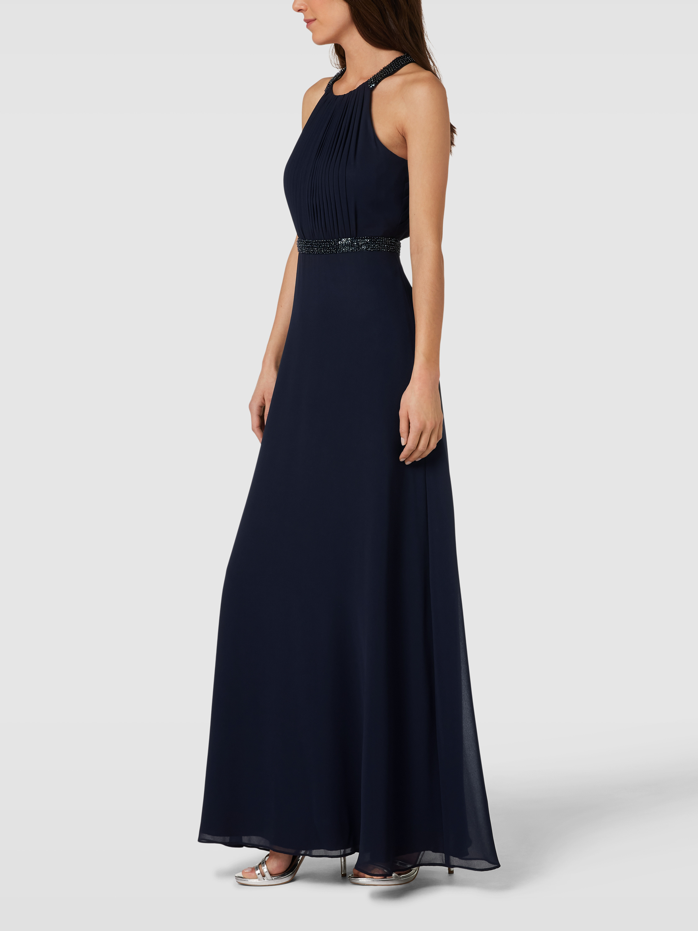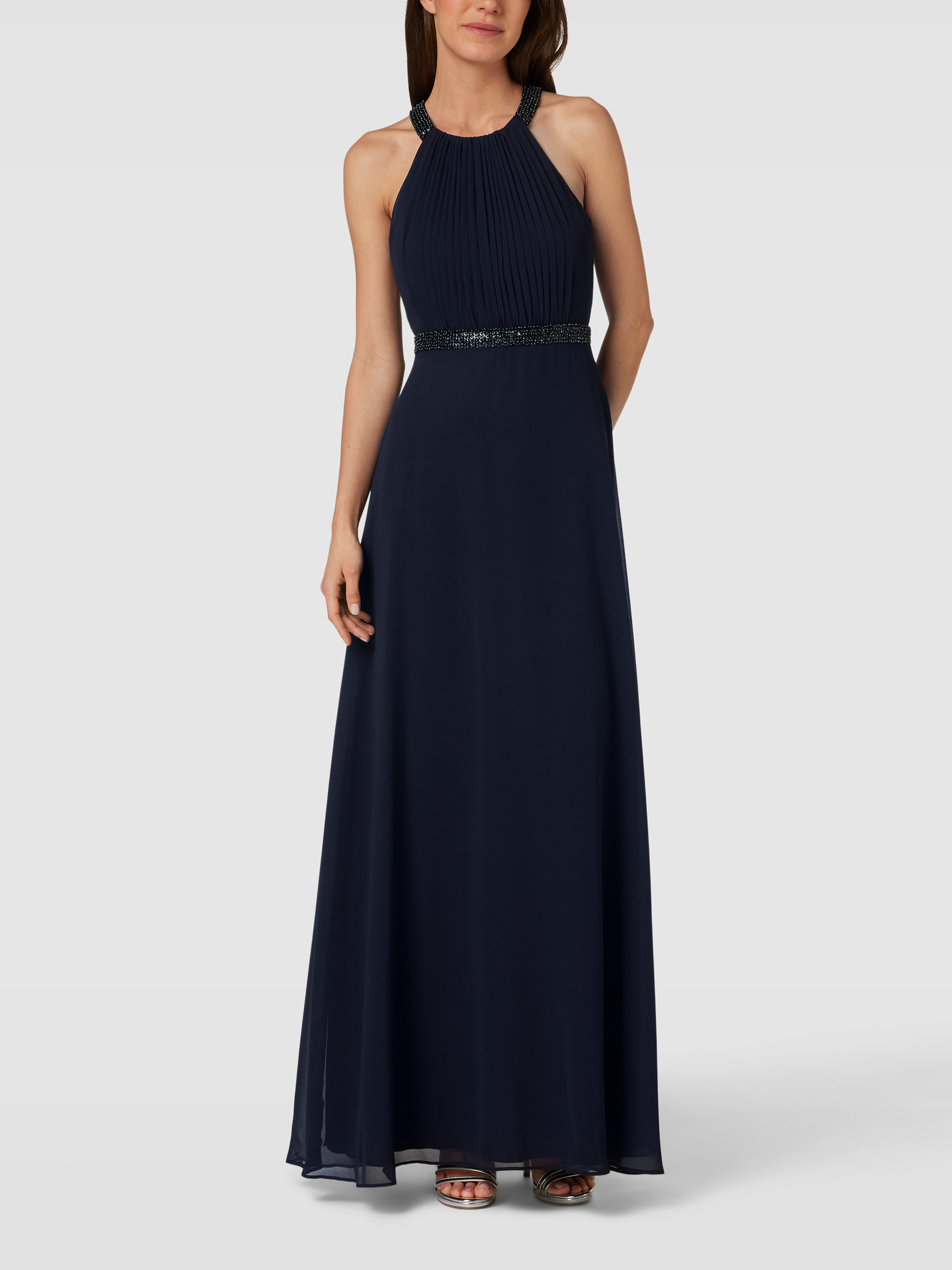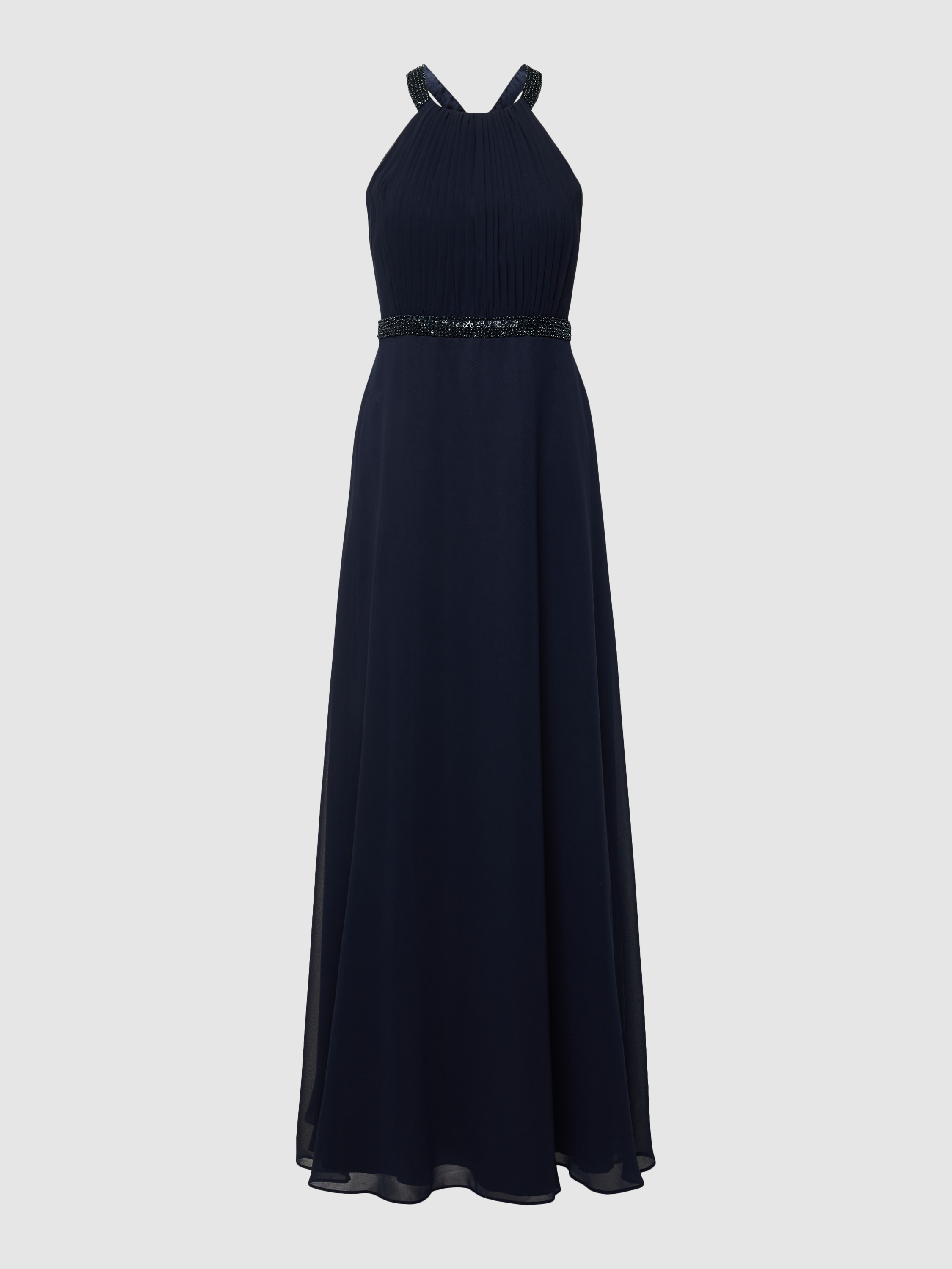 V.M.Avondjurk met siersteentjes en plooien in marineblauw