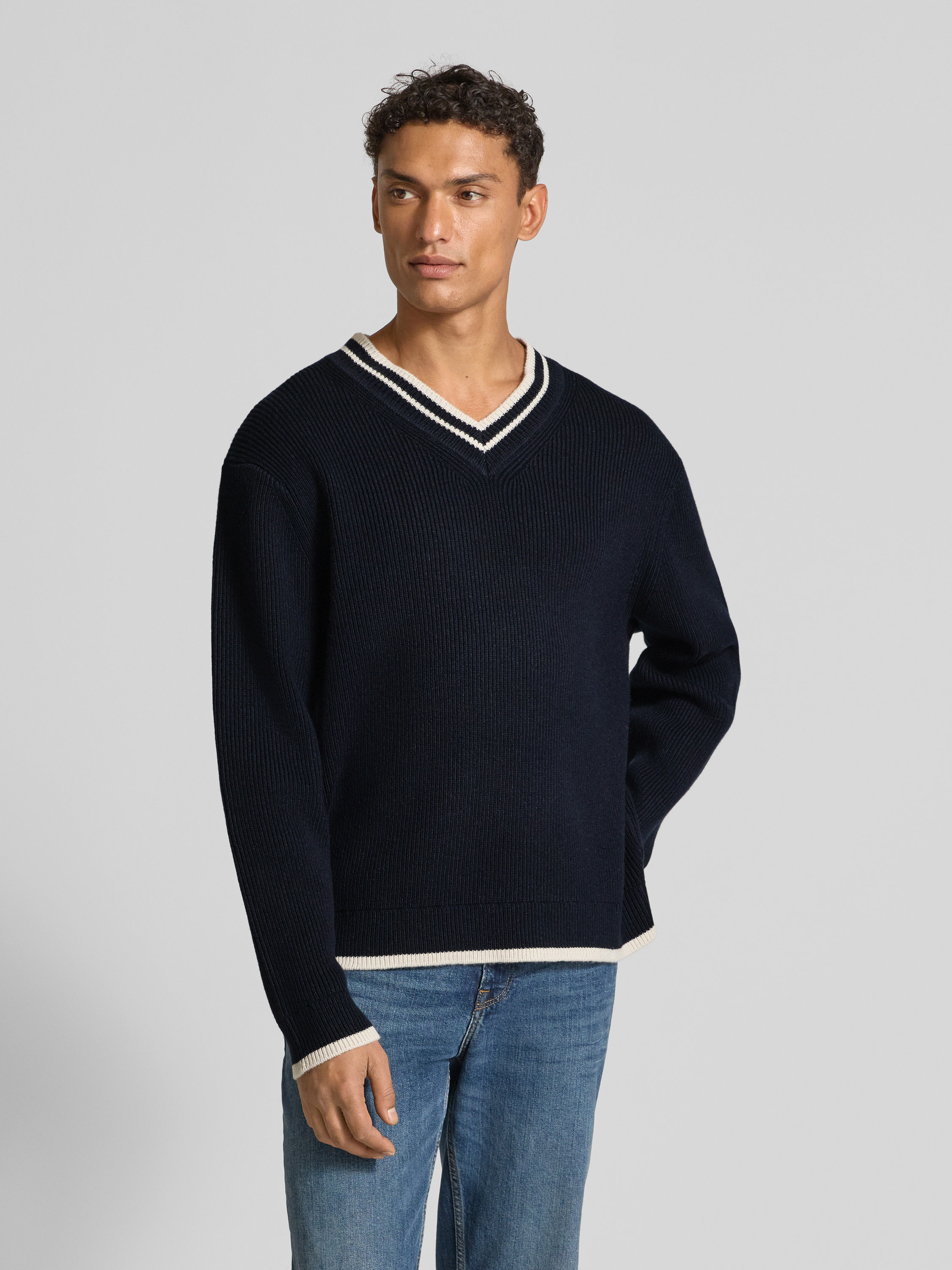Gebreide pullover met ribboorden, model 'Cobek' in marineblauw
